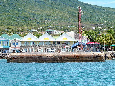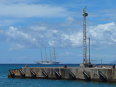 Das Molenfeuer auf der Fähren Pier im Hafen von Charlestown, Nevis, Kleine Antillen Im Hintergrund die Starclipper vor Anker. Position: 17° 08′ 19.47″ N / 62° 37′ 52.27″ W Internationale Reg. Nr.: J 5678 Tragweite: ? In Betrieb seit ? Turmhöhe: 5 m Feuerhöhe: 7 m