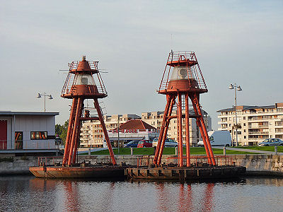 In der Nähe von dem alten Unterfeuer Leughenaer liegen in einem Hafenbecken diese beiden ausgedienten riesigen Leuchttonnen.