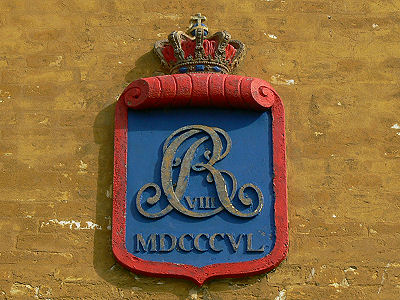 Die königliche Inschrift von Christian VIII. am Turm mit dem Baujahr 1845 des Møns–Klint Fyr.