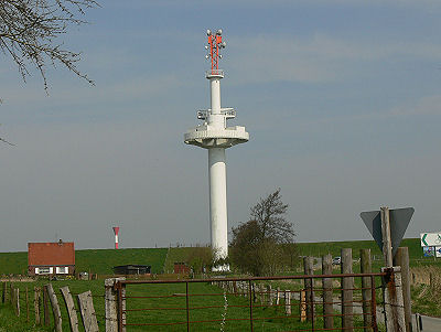 Radarturm am Hadelner Kanal (Deich) bei Belum, Elbe, Niedersachsen.